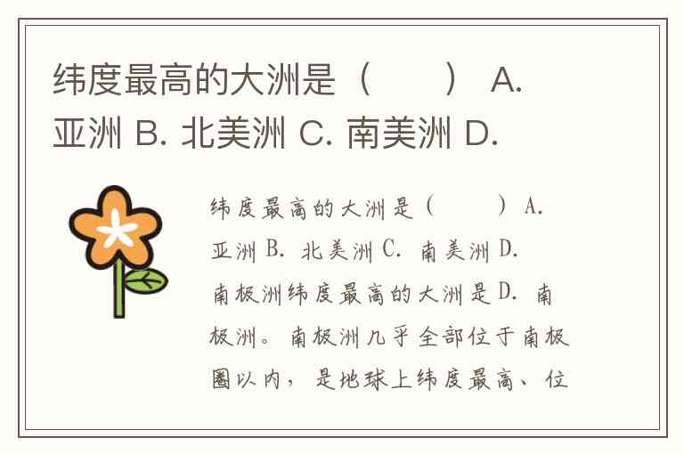 纬度最高的大洲是( ) A. 亚洲 B. 北美洲 C. 南美洲 D. 南极洲