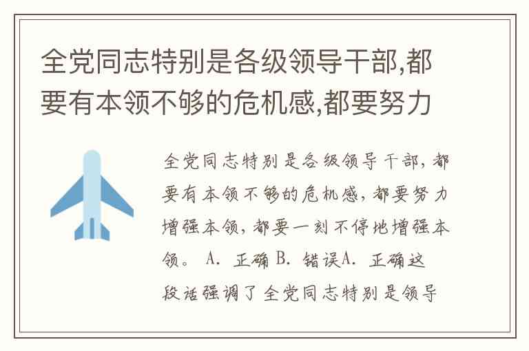 全党同志特别是各级领导干部,都要有本领不够的危机感,都要努力增强本领,都要一刻不停地增强本领。 A. 正确 B. 错误