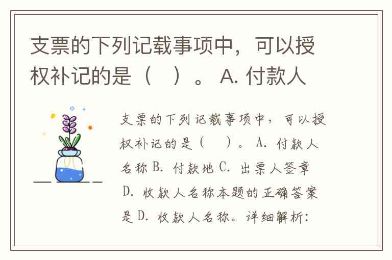 支票的下列记载事项中,可以授权补记的是( )。 A. 付款人名称 B. 付款地 C. 出票人签章 D. 收款人名称
