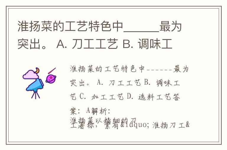 淮扬菜的工艺特色中______最为突出。 A. 刀工工艺 B. 调味工艺 C. 加工工艺 D. 选料工艺