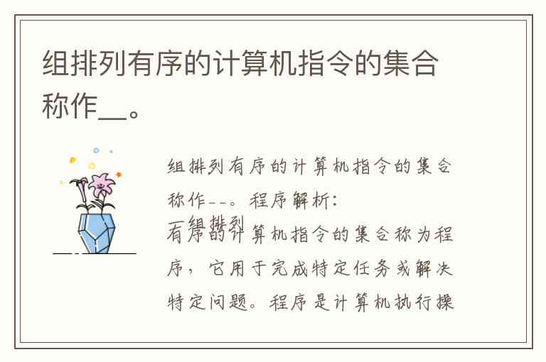 解析:一组排列有序的计算机指令的集合称为程序,它用于完成特定任务或解决特定问题。程序是计算机执行操作的依据,通常由程序设计语言编写,最终转换为机器指令在计算机上运行。