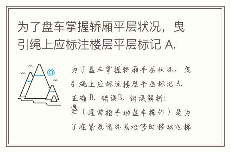 为了盘车掌握轿厢平层状况,曳引绳上应标注楼层平层标记 A. 正确 B. 错误