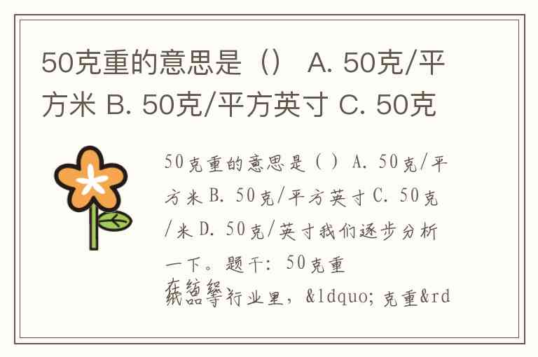 50克重的意思是() A. 50克/平方米 B. 50克/平方英寸 C. 50克/米 D. 50克/英寸