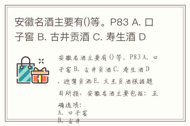 安徽名酒主要有()等。P83 A. 口子窖 B. 古井贡酒 C. 寿生酒 D. 迎驾贡洒 E. 文王贡酒