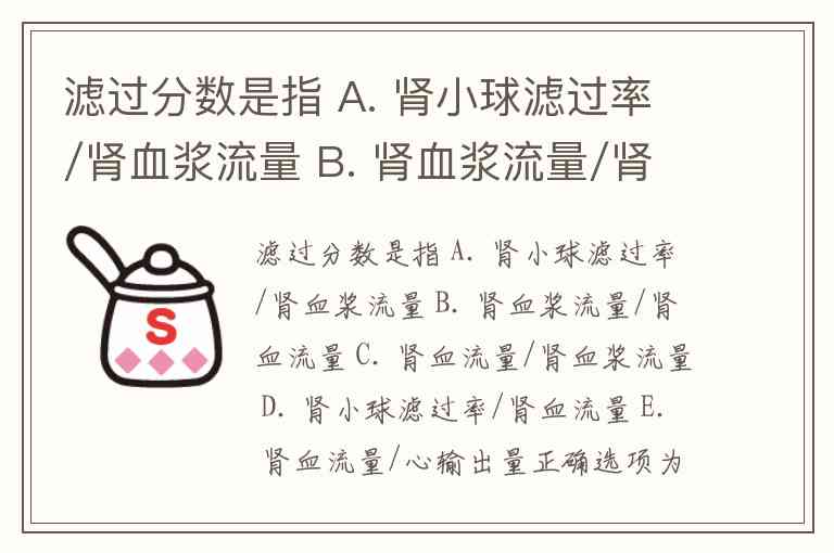 滤过分数是指 A. 肾小球滤过率/肾血浆流量 B. 肾血浆流量/肾血流量 C. 肾血流量/肾血浆流量 D. 肾小球滤过率/肾血流量 E. 肾血流量/心输出量