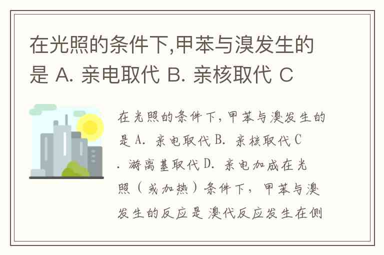 在光照的条件下,甲苯与溴发生的是 A. 亲电取代 B. 亲核取代 C. 游离基取代 D. 亲电加成