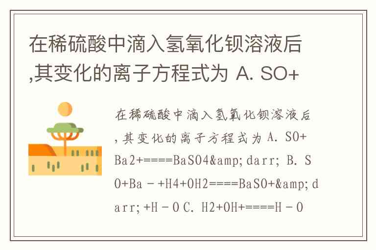 在稀硫酸中滴入氢氧化钡溶液后,其变化的离子方程式为 A. SO+Ba2+====BaSO4↓ B. SO+Ba-+H4+OH2====BaSO+↓+H-O C. H2+OH+====H-O D. 2H2++SO+2OH+Ba====BaSO↓+2HO