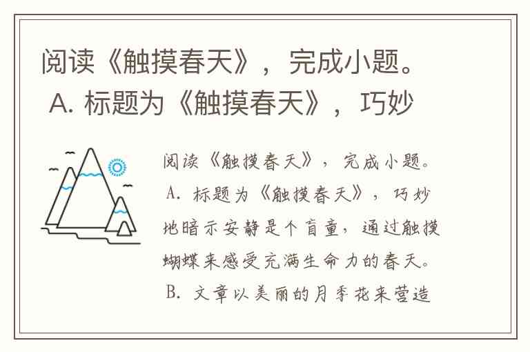 阅读《触摸春天》,完成小题。 A. 标题为《触摸春天》,巧妙地暗示安静是个盲童,通过触摸蝴蝶来感受充满生命力的春天。 B. 文章以美丽的月季花来营造春天的氛围,而安静就生活在这样美好的环境中。 C. 本文通过安静拢住蝴蝶而后放飞蝴蝶,刻画出一个爱护小动物、保护环境的天真善良的盲童现象。 D. 文章卒章显志,告诉人们要热爱生活、创造属于自己的缤纷世界。