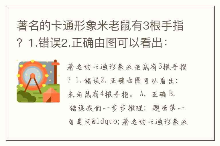 著名的卡通形象米老鼠有3根手指?1.错误2.正确由图可以看出:米老鼠有4根手指。 A. 正确 B. 错误