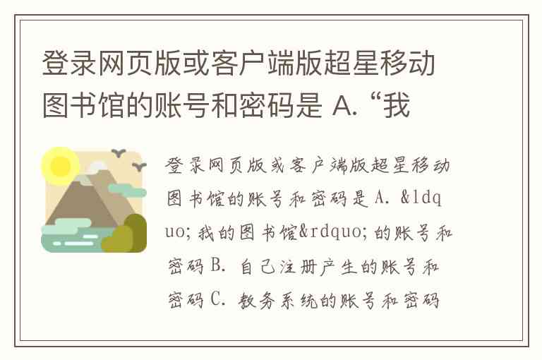 登录网页版或客户端版超星移动图书馆的账号和密码是 A. “我的图书馆”的账号和密码 B. 自己注册产生的账号和密码 C. 教务系统的账号和密码 D. 中科考试题库的账号和密码