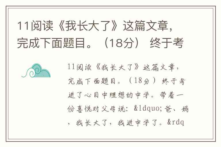 11阅读《我长大了》这篇文章,完成下面题目。(18分) 终于考进了心目中理想的中学。带着一份喜悦对父母说:“爸、妈,我长大了,我进中学了。”父母一脸笑意:“不,孩子,成为中学生并不代表你成为大人。” 于是,我继续等着“长大”的到来。 在脸上发现了第一颗青春痘,带着一份期盼对父母说:“爸、妈,我长大了,我有青春痘了。”父母一脸笑意:“不,孩子,青春痘并不证明你长大。” 渐渐,“长大”在繁忙的学业中也被淡忘。 后来,搬了家。家与车站有一段很长的路,于是邻家的孩子总是用自己的自行车捎我一段。 那是一个阴雨蒙蒙的清晨,雾气很重,路上很滑。一不小心,邻家孩子的自行车撞倒了人,我被重重地摔在地上。没有等我反应过来,邻家的孩子已扶起自行车逃之夭夭。我终于意识到发生了什么事,这样的事还是走了为好,但是,当我要起步时,却发现被撞的是位瘦小的老太太。 许多人围了过来。我有些惭愧,于是,我低着头帮老太太拾起散落在地上的菜。突然,在人群中我竟发现了父亲那深邃的目光。我开始害怕,今天闯这样的祸,回去会怎样呢? 我把老太太送回家,才发现她的儿女并不孝。老太太丝毫没有责备我的意思,她只是说她很寂寞。于是,我说,我会常常去看她。 我并不想敷衍她,我决定这么做。 然而,我不知道如何面对父母。 小心翼翼地回到家,准备先做“乖宝宝”,然后再坦白交代,想来会少些责骂。晚饭桌上,气氛并不如想像的恶劣,而且桌上也多了几样我爱吃的小菜。吃饭时,我小心地边吃边看着父亲。父亲很和蔼,不时夹菜给我。我等待着父亲的训斥,而父亲却只是询问了老婆婆的情况,嘱咐我一定要多陪陪老婆婆。 依然记得那天父母在睡前地对我说的话:“孩子,你懂得了什么叫责任。”我终于感觉到父母承认了我的长大;我也终于明白, 长大并不像考上中学那么容易,也不像长青春痘那么简单。长大,意味着承担责任。 的确,并不是所有长大的人都能够承担责任的;然而,能够承担责任的人却一定是长大了。 小题1:用简洁的语言概括本文的主要内容。(3分) 小题2:写出下列句子中划线词在文中的意思。(4分) (1)小的时候想 长大。 (2)我终于感觉到父母承认了我的 长大。 小题3:简要谈谈你对文中划线句子的理解。(3分) 小题4:“我”的成长离不开父母的关怀和教育,请从文中举出一例来加以说明。(4分) 小题5:选文结尾写到“长大,意味着责任。” 你认为长大还意味着什么?请结合实际或自身的经历,谈谈你的看法。(4分)