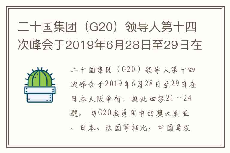 二十国集团(G20)领导人第十四次峰会于2019年6月28日至29日在日本大阪举行。据此回答21~24题。 与G20成员国中的澳大利亚、日本、法国等相比,中国是发展中国家。划分发达国家与发展中国家的依据是( ) A. 自然条件差异 B. 政治地图变化 C. 经济发展水平差异 D. 社会制度不同