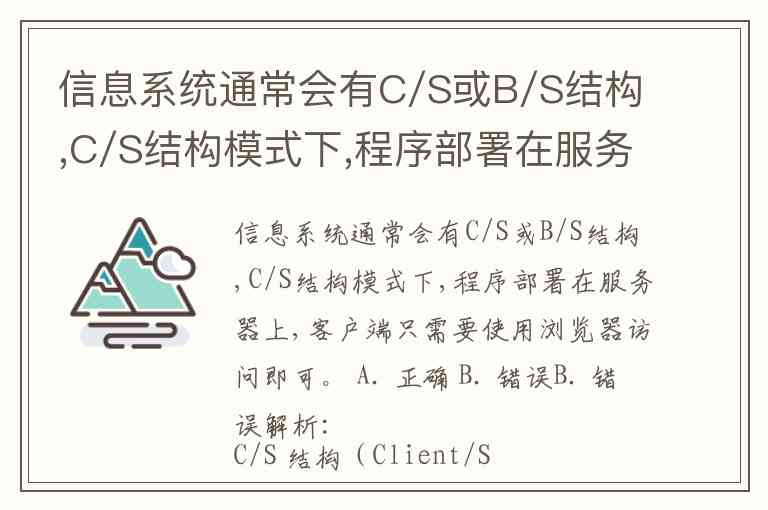 信息系统通常会有C/S或B/S结构,C/S结构模式下,程序部署在服务器上,客户端只需要使用浏览器访问即可。 A. 正确 B. 错误