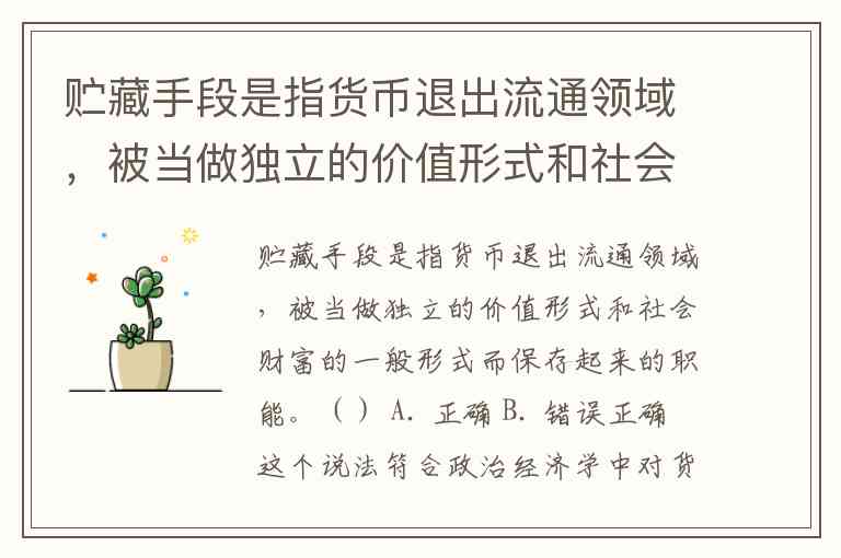 贮藏手段是指货币退出流通领域,被当做独立的价值形式和社会财富的一般形式而保存起来的职能。() A. 正确 B. 错误