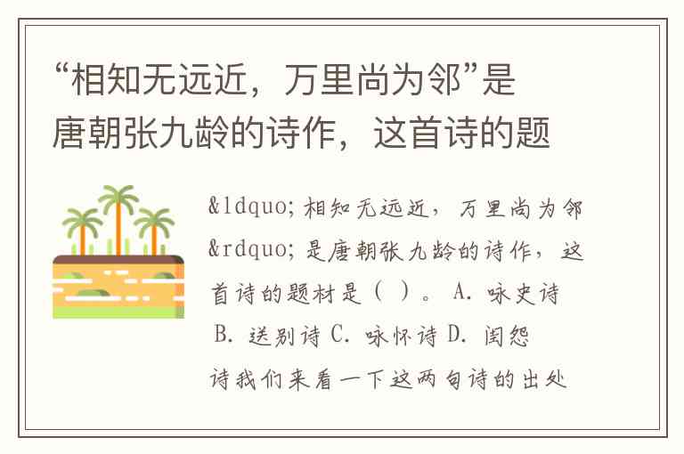 “相知无远近,万里尚为邻”是唐朝张九龄的诗作,这首诗的题材是( )。 A. 咏史诗 B. 送别诗 C. 咏怀诗 D. 闺怨诗
