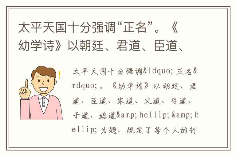 材料中所引《幼学诗》《天父诗》的内容,强调的是等级森严的伦理秩序和绝对服从的君臣、父子、夫妇关系,如“朝廷”强调天朝威严不可违抗,“天父诗”强调下位者(媳、婶、臣)的错误不应归咎于上位者(爷、哥、主)。