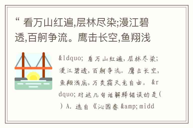 — 这是有问题的,原文“独立寒秋,湘江北去,橘子洲头”是上阕开头,题目引用的“看万山红遍……”是“独立寒秋”之后所“看”的景象,所以这几句本身并不是描绘“独立寒秋”这个画面,而是寒秋中所看到的江、山、鹰、鱼等景物。因此选项表述可能不够准确,但看B的意思,如果说“描绘了一幅独立寒秋时看到的壮丽秋景”就通顺,可这里只写到“一幅独立寒秋”,显然表意不完整,如果原题B真的是“作者为我们描绘了一幅独立寒秋”,那是不对的。