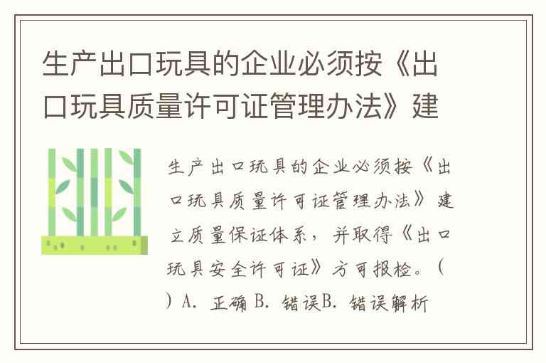 解析:根据中国对出口玩具的现行管理规定,生产企业必须建立出口玩具质量安全管理体系,并取得的是 《出口玩具生产企业质量许可(注册登记)证书》,而不是《出口玩具安全许可证》。企业取得该证书后,其出口玩具才可按规定办理报检手续。因此,题目中的证书名称表述不准确,故判定为错误。