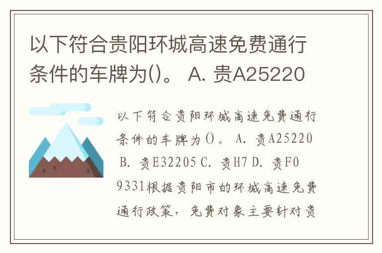 以下符合贵阳环城高速免费通行条件的车牌为()。 A. 贵A25220 B. 贵E32205 C. 贵H7 D. 贵F09331