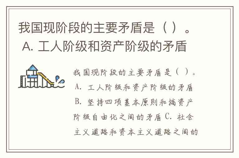 我国现阶段的主要矛盾是( )。 A. 工人阶级和资产阶级的矛盾 B. 坚持四项基本原则和搞资产阶级自由化之间的矛盾 C. 社会主义道路和资本主义道路之间的矛盾 D. 人民日益增长的物质文化需要同落后生产力之间的矛盾