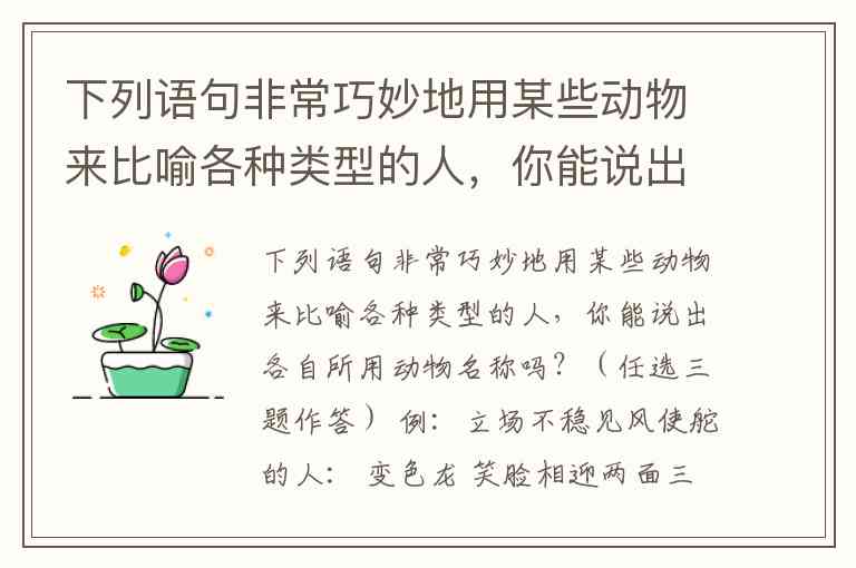 下列语句非常巧妙地用某些动物来比喻各种类型的人,你能说出各自所用动物名称吗?(任选三题作答) 例:立场不稳见风使舵的人: 变色龙 笑脸相迎两面三刀的人: 一毛不拔吝啬钱财的人: 孤陋寡闻见识不广的人: 没有依靠无处投奔的人: 强横无赖独霸一方的人: 毫无主见随声附和的人: