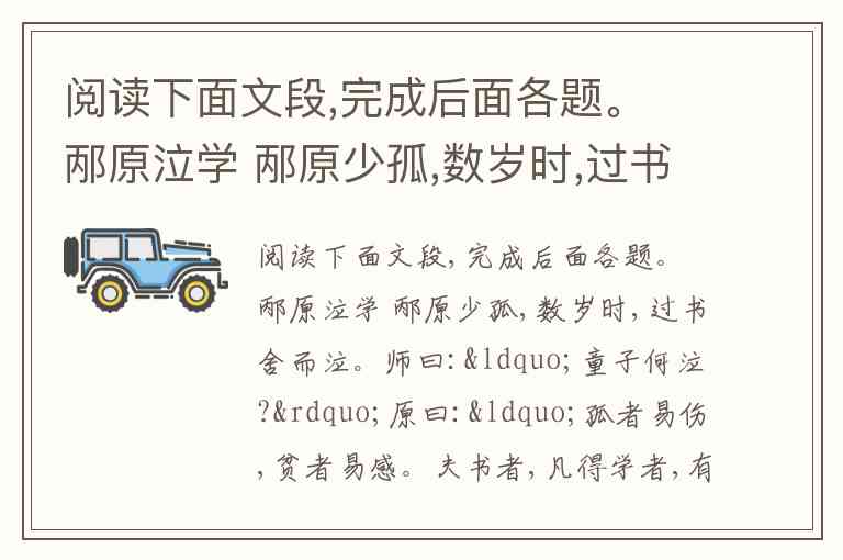 阅读下面文段,完成后面各题。 邴原泣学 邴原少孤,数岁时,过书舍而泣。师曰:“童子何泣?”原曰:“孤者易伤,贫者易感。夫书者,凡得学者,有亲也。一则愿其不孤,二则羡其得学,中心感伤,故泣耳。”师恻然曰:“欲书可耳!”原曰:“无钱资。”师曰:“童子苟有志,吾徒相教,不求资也。”于是遂就书。一冬之间,诵《孝经》《论语》。 (《初潭集》)(1)下列句子中划线的词解释正确的一项是( ) A. 凡得学者(得到) B. 吾徒相教(只是) C. 贫者易感(感受) D. 师恻然曰(怜悯) E. 吾视其辙乱 B、欲穷其林 C、其真无马邪? D、安陵君其许寡人 F. 书塾中的老师值得我们敬佩的是为下一代无私奉献的精神。 B、我们应该向学习邴原贫不丧志,立志求学的精神和他在学习上刻苦勤奋的精神。 C、邴原对有父母的孩子充满了妒忌之心。 D、邴原能够上学,是因为他的求学之心打动了老师。
