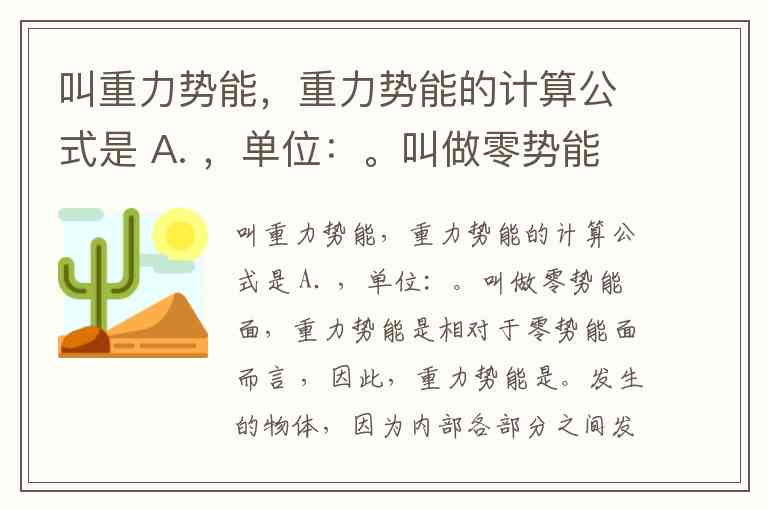 叫重力势能,重力势能的计算公式是 A. ,单位:。叫做零势能面,重力势能是相对于零势能面而言 ,因此,重力势能是。发生的物体,因为内部各部分之间发生了而具有的能叫做弹性势能,弹性势能的大小与 B. 和都有关。