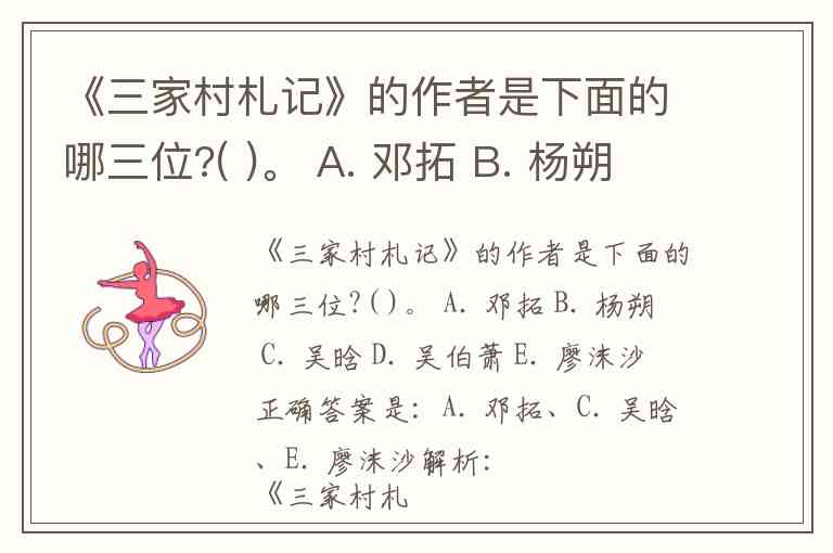《三家村札记》的作者是下面的哪三位?( )。 A. 邓拓 B. 杨朔 C. 吴晗 D. 吴伯萧 E. 廖沫沙