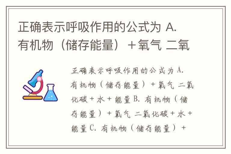正确表示呼吸作用的公式为 A. 有机物(储存能量)+氧气 二氧化碳+水+能量 B. 有机物(储存能量)+氧气 二氧化碳+水+能量 C. 有机物(储存能量)+氧气 二氧化碳+水 D. 有机物(储存能量)+氧气 二氧化碳+水