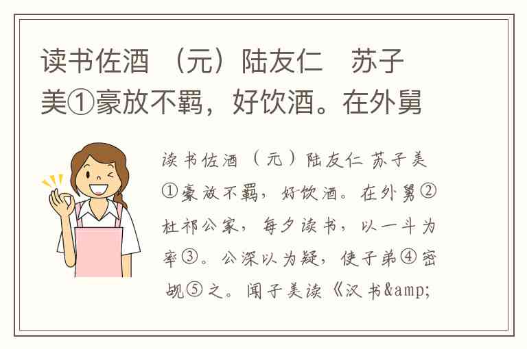 苏子美是一个豪放不羁、热爱读书、性情率真的人。他饮酒不以常理为限,以读书为下酒之物,读到激动处便抚掌感慨、举杯痛饮,可见其洒脱真性情与对历史人物的深切共鸣。