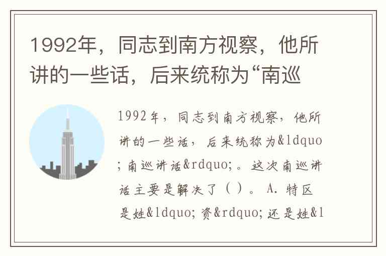 1992年的南巡讲话是在中国改革开放关键时期发表的一系列重要谈话。其核心是进一步解放思想,坚持改革开放,并明确回答了当时困扰和阻碍改革步伐的一系列重大理论认识问题,其中最关键的就是关于经济特区等改革开放举措是姓“资”还是姓“社”的问题。