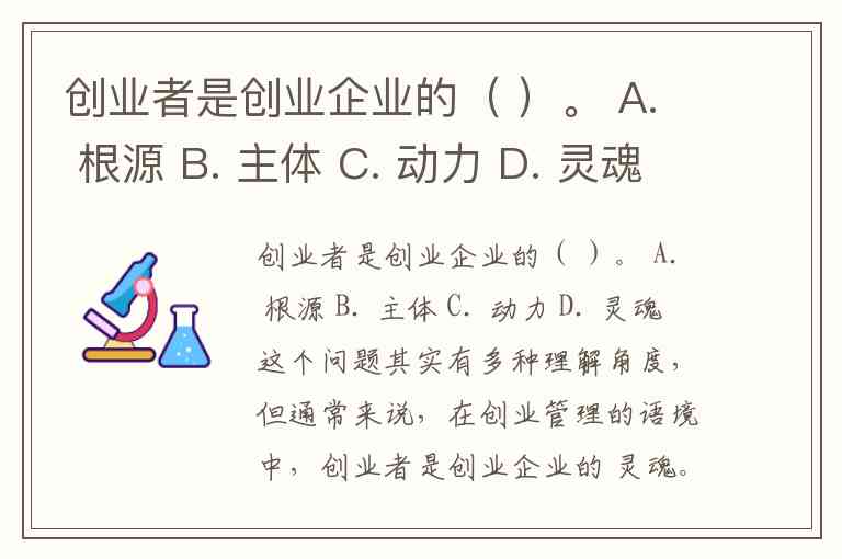 创业者是创业企业的( )。 A. 根源 B. 主体 C. 动力 D. 灵魂