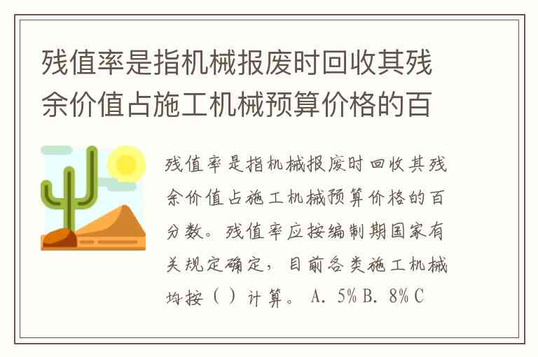 残值率是指机械报废时回收其残余价值占施工机械预算价格的百分数。残值率应按编制期国家有关规定确定,目前各类施工机械均按()计算。 A. 5% B. 8% C. 10% D. 3%