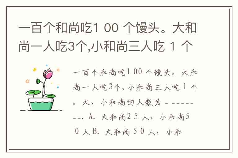 一百个和尚吃1 00 个馒头。大和尚一人吃3个,小和尚三人吃 1 个。大、小和尚的人数为 _ _______. A. 大和尚2 5 人,小和尚5 0 人 B. 大和尚 5 0 人,小和尚5 0 人 C. 大和尚2 5 人,小和尚7 5 人 D. 大和尚 2 5 人,小和尚2 5 人