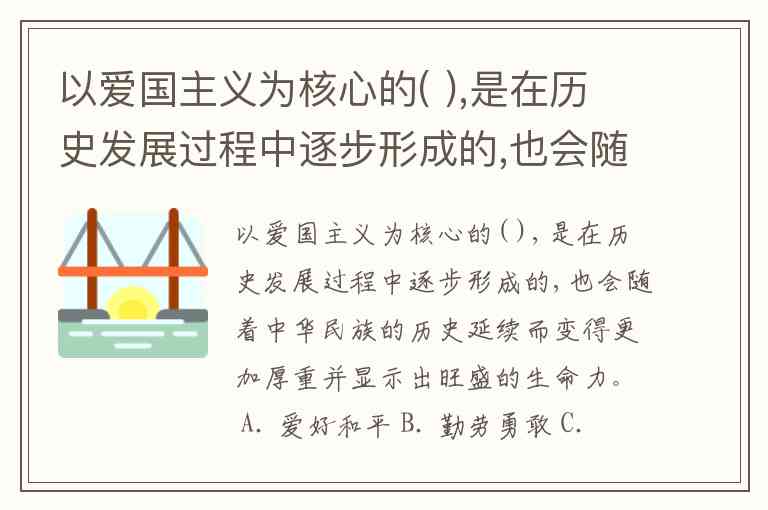 以爱国主义为核心的( ),是在历史发展过程中逐步形成的,也会随着中华民族的历史延续而变得更加厚重并显示出旺盛的生命力。 A. 爱好和平 B. 勤劳勇敢 C. 民族精神 D. 民族文化