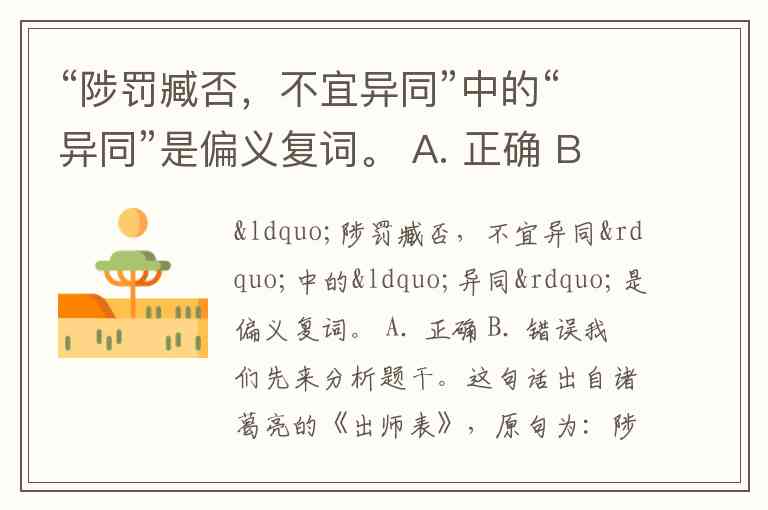 “陟罚臧否,不宜异同”中的“异同”是偏义复词。 A. 正确 B. 错误