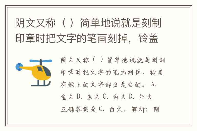 阴文又称( )简单地说就是刻制印章时把文字的笔画刻掉,铃盖在纸上的文字部分是白的。 A. 金文 B. 朱文 C. 白文 D. 阳文