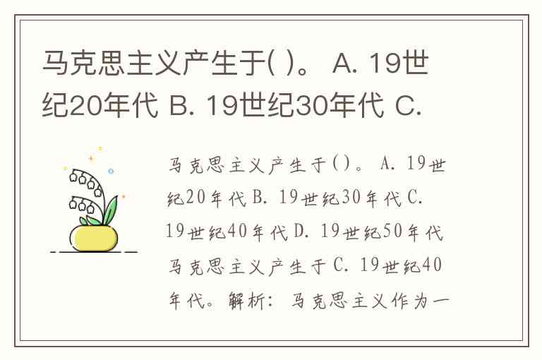 马克思主义产生于( )。 A. 19世纪20年代 B. 19世纪30年代 C. 19世纪40年代 D. 19世纪50年代