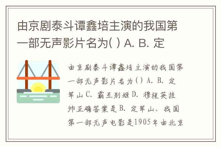 由京剧泰斗谭鑫培主演的我国第一部无声影片名为( ) A. B. 定军山 C. 霸王别姬 D. 穆桂英挂帅
