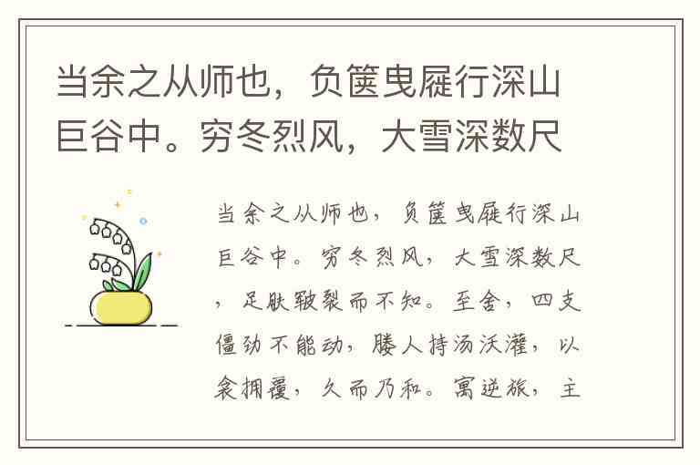 当余之从师也,负箧曳屣行深山巨谷中。穷冬烈风,大雪深数尺,足肤皲裂而不知。至舍,四支僵劲不能动,媵人持汤沃灌,以衾拥覆,久而乃和。寓逆旅,主人日再食,无鲜肥滋味之享。同舍生皆被绮绣,戴朱缨宝饰之帽,腰白玉之环,左佩刀,右备容臭,烨然若神人; A. 足肤皲裂而不知 B. 执策而临之 C. 学而不思则罔 D. 出淤泥而不染 4.读了宋廉求学的故事,联系自己的学习生活谈谈都受到哪些有益的启发。(2分)