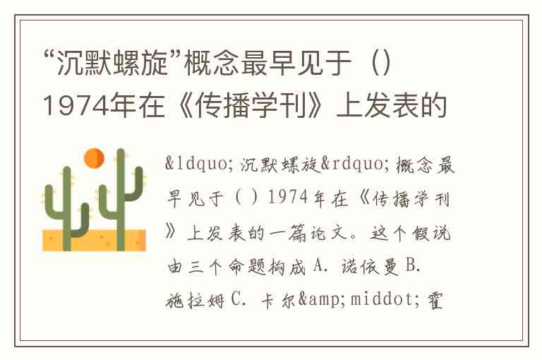 “沉默螺旋”概念最早见于()1974年在《传播学刊》上发表的一篇论文。这个假说由三个命题构成 A. 诺依曼 B. 施拉姆 C. 卡尔·霍夫兰 D. 拉斯维尔