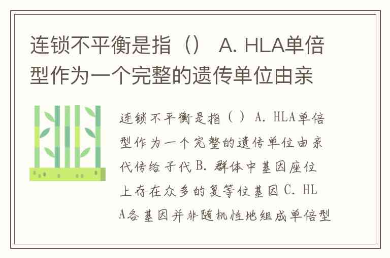 连锁不平衡是指() A. HLA单倍型作为一个完整的遗传单位由亲代传给子代 B. 群体中基因座位上存在众多的复等位基因 C. HLA各基因并非随机性地组成单倍型 D. HLA基因在同一染色体上的组合 E. 某一个体HLA分子特异性型别