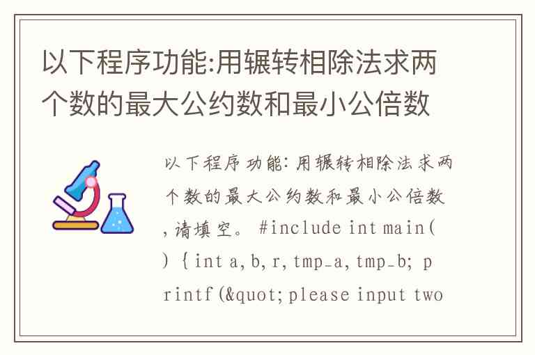 以下程序功能:用辗转相除法求两个数的最大公约数和最小公倍数,请填空。 #include int main() { int a,b,r,tmp_a,tmp_b; printf("please input two numbers:\n"); scanf("%d%d",&a,&b); tmp_a=a; tmp_b=b; r= a____b ; while (r!=0) { a=b; b=r; r=a%b; } printf("最大公约数:%d\n",b); printf("最小公倍数:%d\n", tmp_a*tmp_b/____ ); return 0; }