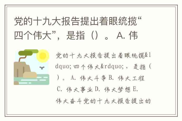 党的十九大报告提出着眼统揽“四个伟大”,是指()。 A. 伟大斗争 B. 伟大工程 C. 伟大事业 D. 伟大梦想 E. 伟大奋斗