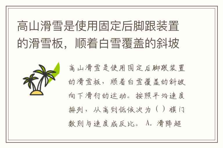 高山滑雪是使用固定后脚跟装置的滑雪板,顺着白雪覆盖的斜坡向下滑行的运动。按照平均速度排列,从高到低依次为()旗门数则与速度成反比。 A. 滑降超级大回转大回转-回转 B. 滑降-回转大回转超级大回转 C. 回转超级大回转大回转滑降 D. 回转大回转超级大回转滑降