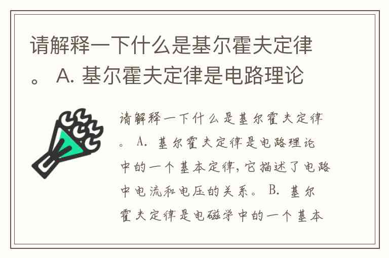 请解释一下什么是基尔霍夫定律。 A. 基尔霍夫定律是电路理论中的一个基本定律,它描述了电路中电流和电压的关系。 B. 基尔霍夫定律是电磁学中的一个基本定律,它描述了磁场中能量和力的关系。