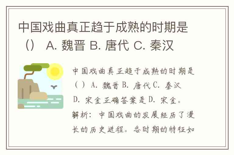 中国戏曲真正趋于成熟的时期是() A. 魏晋 B. 唐代 C. 秦汉 D. 宋金