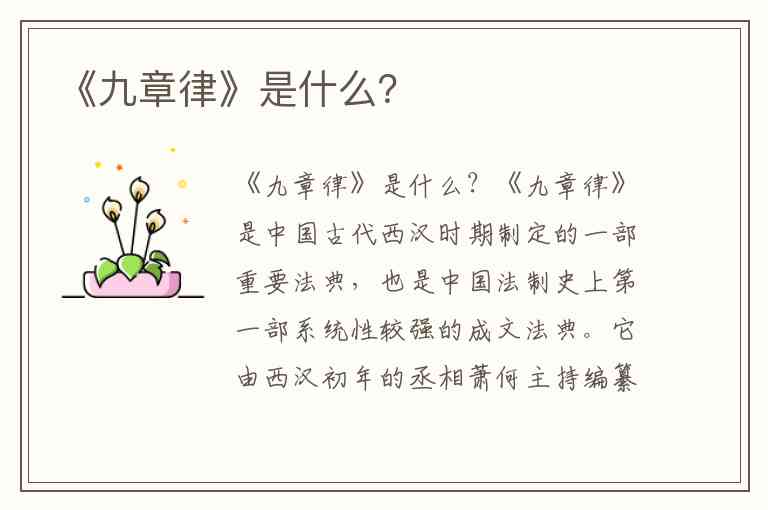 《九章律》是中国古代西汉时期制定的一部重要法典,也是中国法制史上第一部系统性较强的成文法典。它由西汉初年的丞相萧何主持编纂,于汉高祖刘邦时期(约公元前200年左右)颁布实施。
