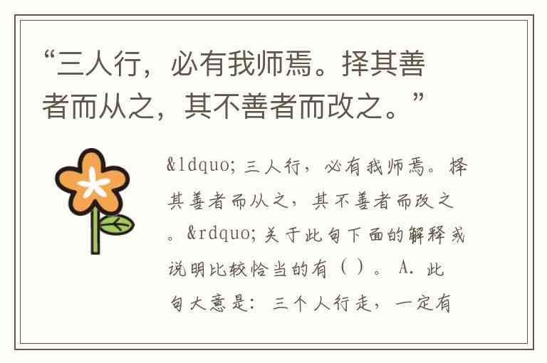 A:解释偏差较大。“必有我师焉”不是单纯说“有我的老师”,而是说其中有人可以为我所师法的地方;“择其善者而从之”并非指“跟着善良的老师”,而是选择他们的优点去学习。所以 A 不恰当。