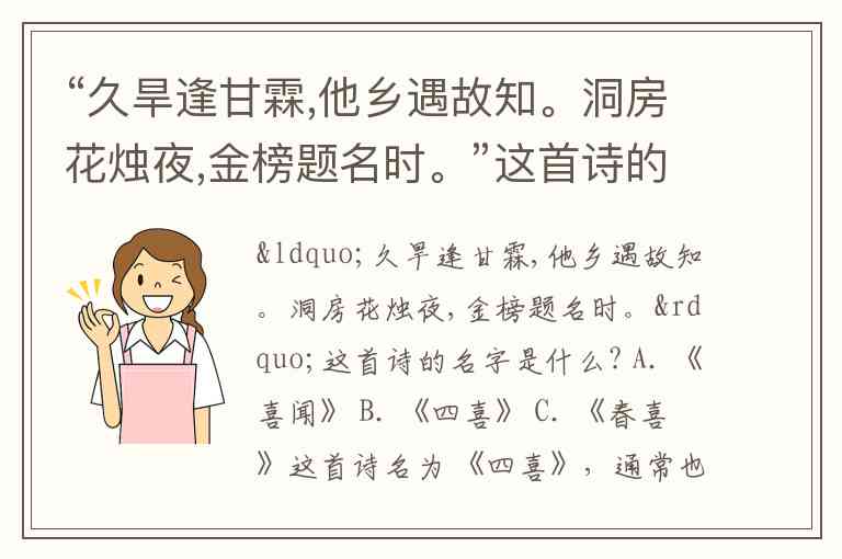 “久旱逢甘霖,他乡遇故知。洞房花烛夜,金榜题名时。”这首诗的名字是什么? A. 《喜闻》 B. 《四喜》 C. 《春喜》